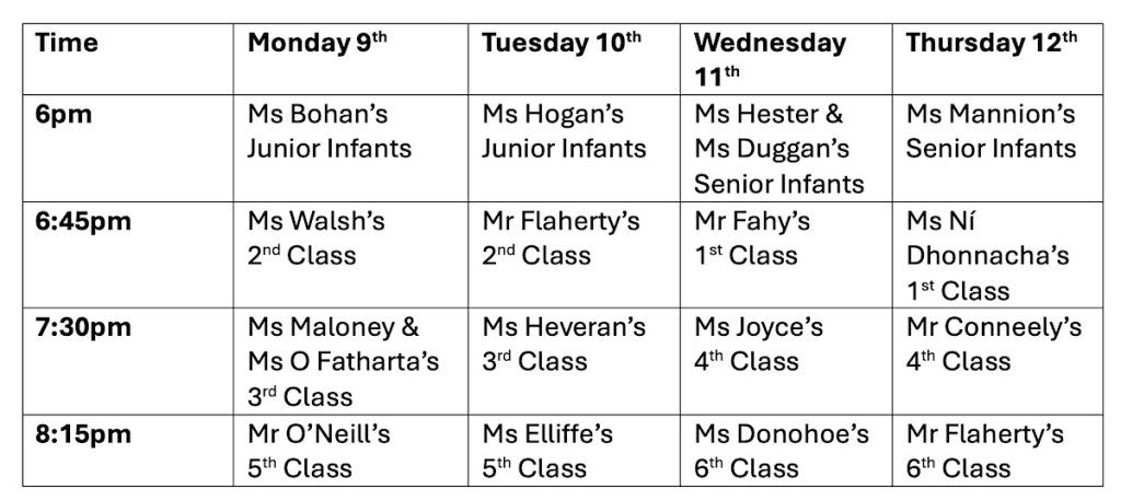 The main gates of the front yard will be closed and no parking will be available to parents in the front yard of the school. Parking will be available to parents in the rear yard of the school via the Arus Uilinn carpark. We would ask parents not to park in the Arus Uilinn carpark itself as other activities will be taking place in Arus Uilinn. Please also be aware that 2 big events will be taking place in the church on the Monday and the Wednesday nights.